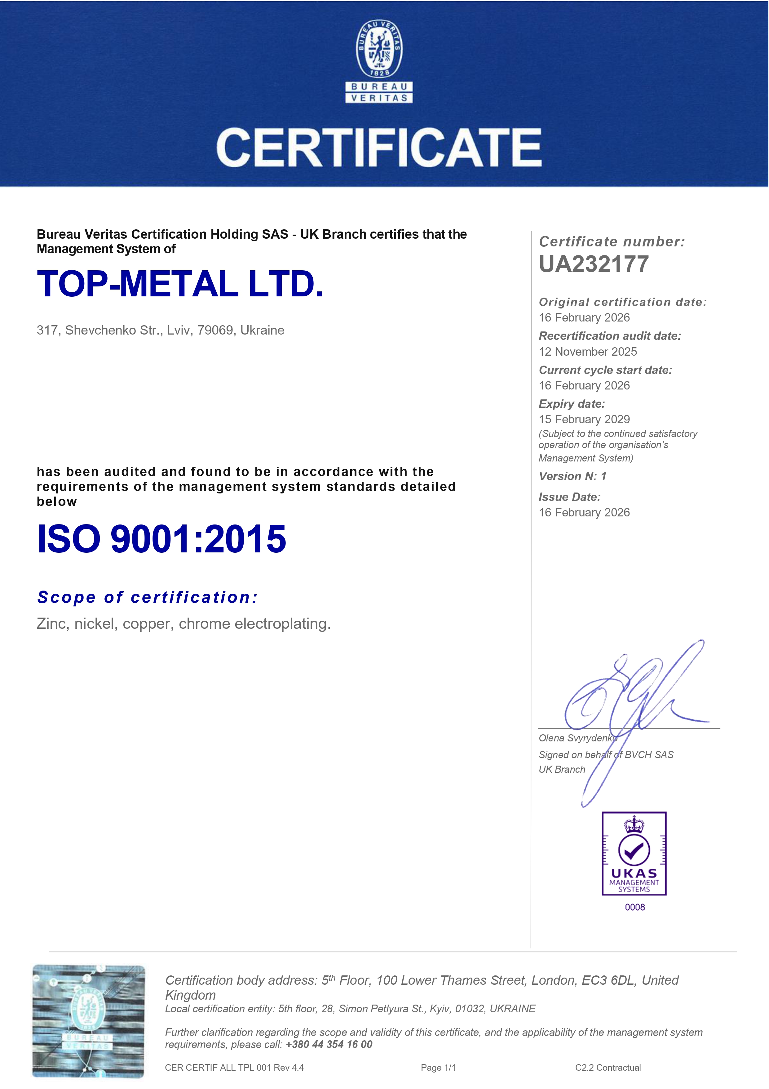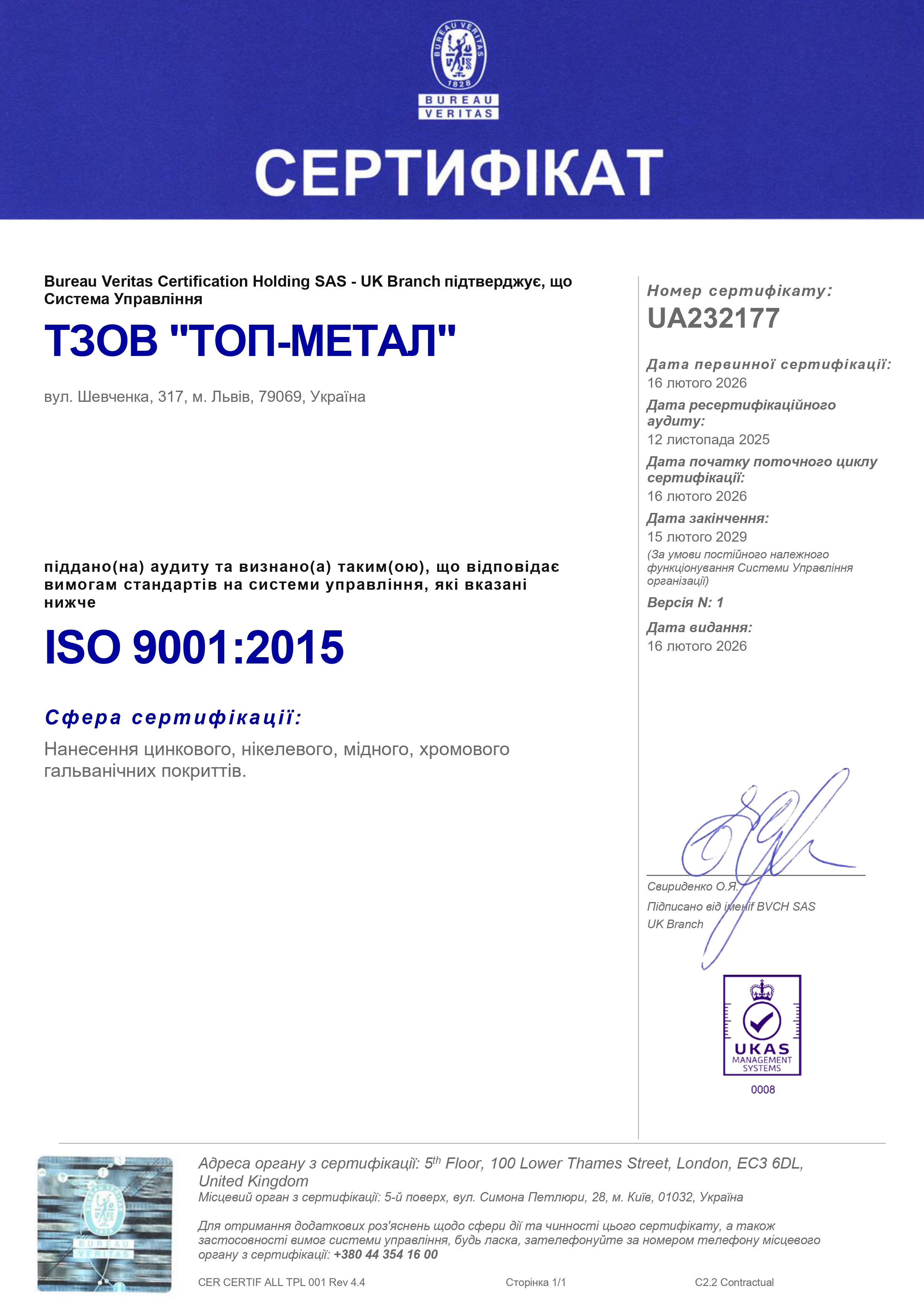 Цей сертифікат підтверджує, що в нас функціонує та є налагодженою система менеджменту, яка гарантує високу якість надання наших послуг.